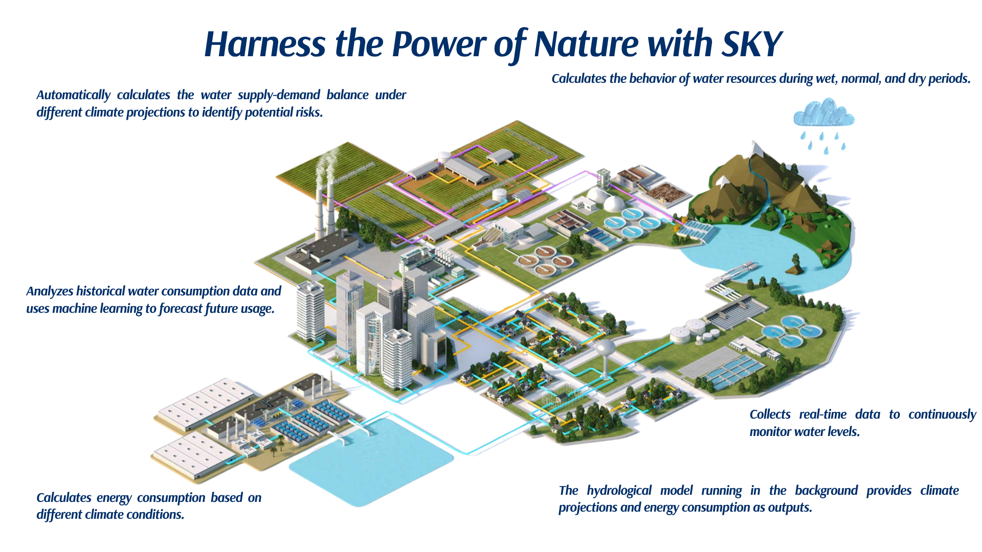 SKY, kurak dönemler, yağışlı dönemler ve beklenen koşullar için senaryolar yoluyla su kaynakları yönetimini optimize ederek riskleri etkili bir şekilde azaltmayı amaçlamaktadır.