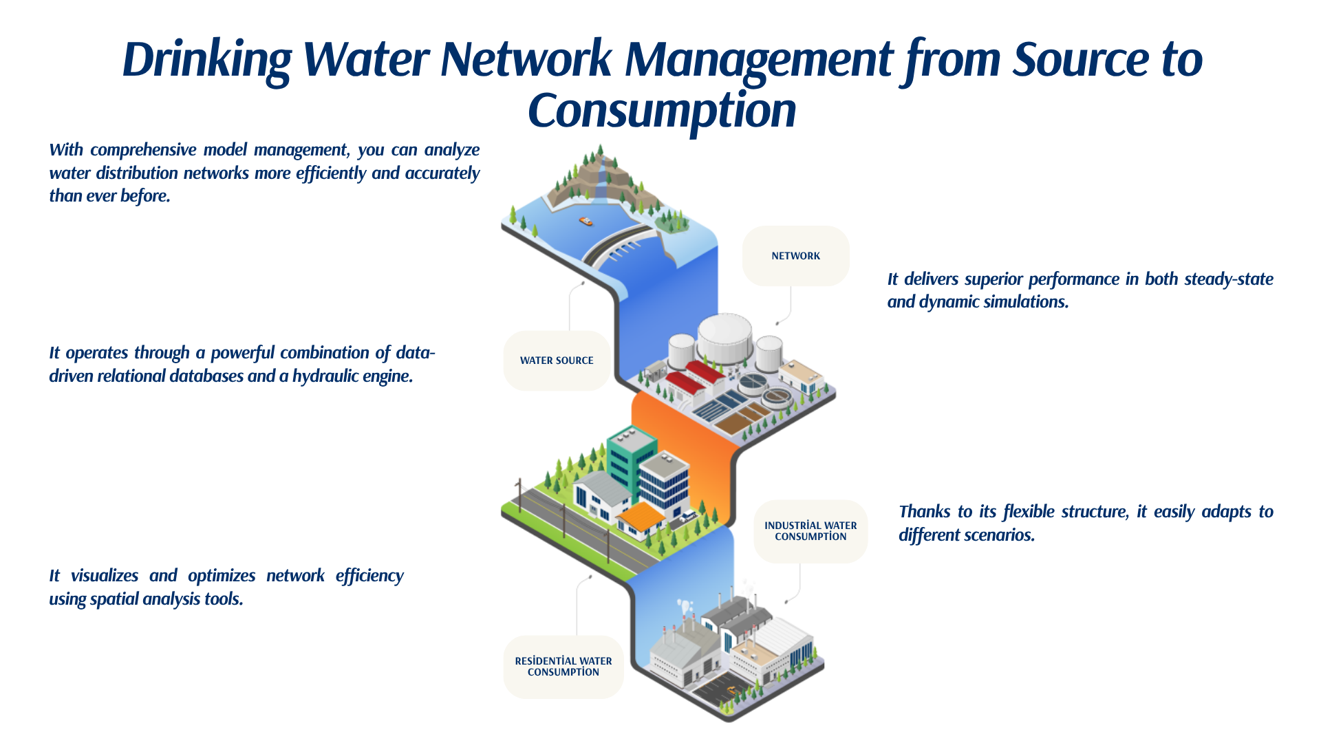 Arıtma tesisinden tüketim noktasına kadar suyun hareketinin izlenmesi, su kalitesinin sürekli olarak normlara uygun şekilde değerlendirilmesini sağlar. Hidrolik modelleme ve izleme sistemleri ile suyun yaşlanma süreci analiz edilerek, suyun fiziksel, kimyasal ve biyolojik özellikleri detaylı şekilde incelenir.